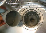 A4.家中の排水経路はつながっているため、トイレのように勢いよく大量の水を排水すると、排水管内の空気を一時的に圧迫し、排水が終わるとその空気が管内を逆流します。キッチンの排水ロのゴミ取り網を外すと、その下にお椀型の排水トラップが設置されておりますが、これがしっかり固定されていないと、逆流した空気で圧力がかかり「ゴボゴボ」と聞こえます。排水トラップは、設置後まわしてロックをかけるようになっていますので、ロックされているか確認してみてください。