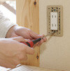 A2.コンセントはネジで固定されておりますので、そのネジを締め付けます。コンセント廻りの溝にマイナスドライバーを差して、カバーを外します。コンセントの差し込みロの上下にあるネジを、軽く締め付けてください。