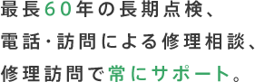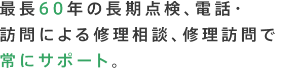 家の資産価値を守るため、30年目まで無償点検、30年目以降は5年ごとに有償点検を行う「ロングサポート60」という長期的なビジョンに基づく点検もご用意。もちろんお客様からの問い合わせに応じて電話による修理相談や実際の修理訪問を行い、常にサポートします。
