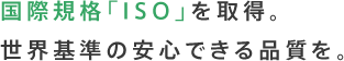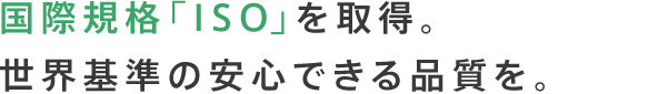 住宅品質保証株式会社では、国際標準化機構=ISOが定める、国際規格を取得しています。顧客に高品質なモノとサービスを提供し、高い顧客満足を実現するためのISO9001という規格。いくつもの基準をクリアして取得する規格です。これから、家を買われるお客様に、より一層安心いただくために、国際基準を満たしています。