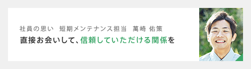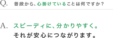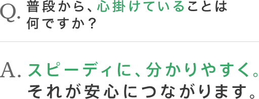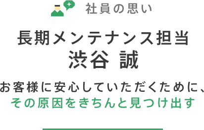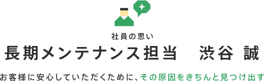 お客様には、専門的な用語は使わないようにしています。やはり、お客様の立場に立って、どれだけ分かりやすく説明するかがとても大事だと思うんです。やはり築10年以降のお宅だと、何か不具合が起きたときには、割と大きな修繕が必要になるんです。そこで、なるべく早く伺って、その原因をきちんと見つけ出すだけでも、お客様はすごく安心してくれます。だから、迅速な対応はとても大事にしていますね。