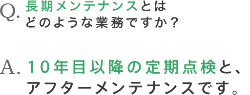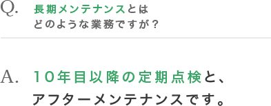 築10年以降の住宅に関する定期点検とアフターメンテナンスがメインです。10年目に保証を延長するための工事をしてもらうことで、その後も15年、18年、20年目と定期的に点検していきます。築10年を過ぎると、どうしても少しずつ家が傷んでいくんですね。特に、水回りやキッチンなど少し大きめのメンテナンスを望まれるお客様が多いです。そのため、リフォームに近いメンテンナンスもご提案します。リフォームも選択肢のひとつですが、それぞれのお宅の状況によって、メンテナンスというフィールドから提案できるのが、私たちの強みです。