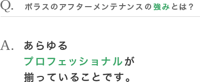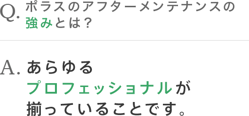 私たち自身の技術は、もちろん磨いています。ただ、大規模修繕となったときにどうしても別の部署や業者さんと一緒に修繕に臨むことがあります。だからこそ、長期サポートでは、外部スタッフとの連携も強めています。自分たちのできるメンテナンスの領域をきちんと見極め、本当に必要なときには優秀なプロフェッショナルとしっかりとタッグを組む。基本的に、お客様の要望を断らないのがポラスのスタンスです。そうできるのも、内外の優秀なスタッフに支えられているからなんです。