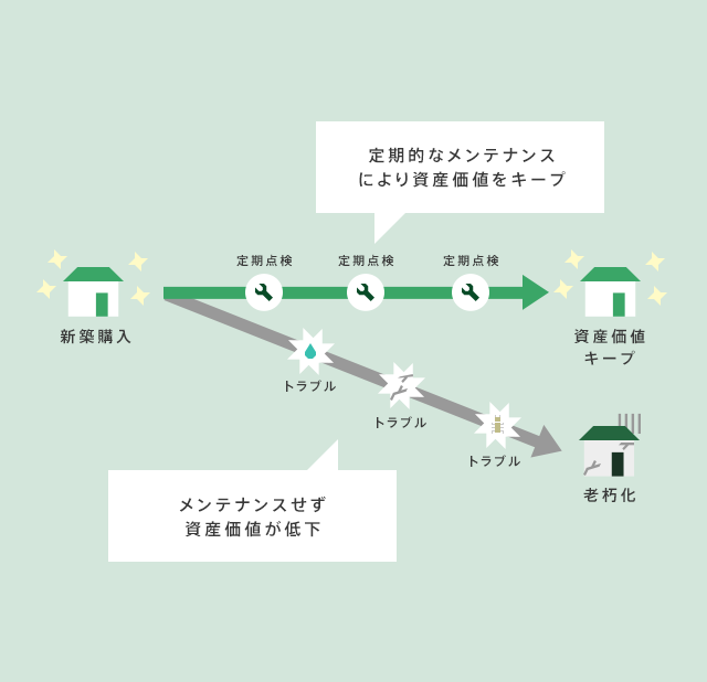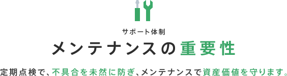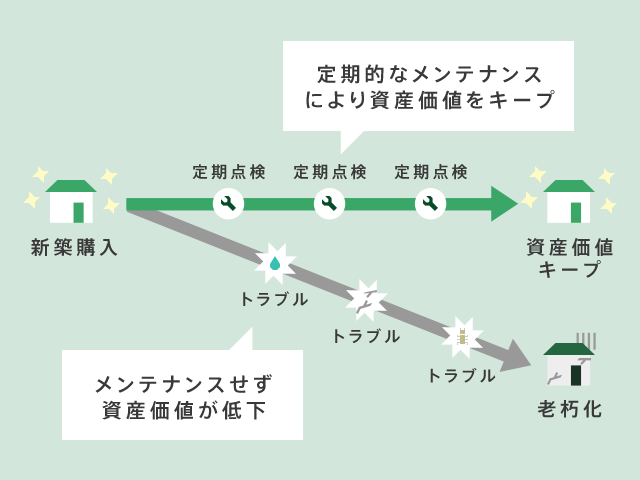 現状は不具合がないと思っていても、家のどこかは、必ず傷んできています。本格的な不具合が起きてからだと、想像よりも修理費は高くつき、資産価値も下がってしまいます。リスクを分散する意味でも、定期的にメンテナンスをすることが重要です。