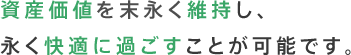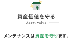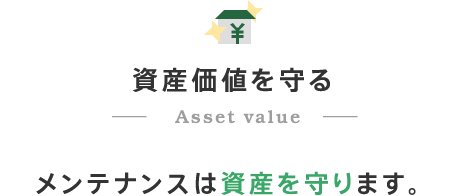 日本の住宅は、年数が経つにつれて資産価値が下がってしまいます。一度下がった価値をあげることは難しく、多額な費用が発生してしまう場合もあります。年数に応じたメンテナンスをすることで、資産価値を守り、長期間保つことが可能になります。