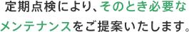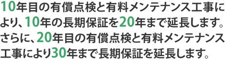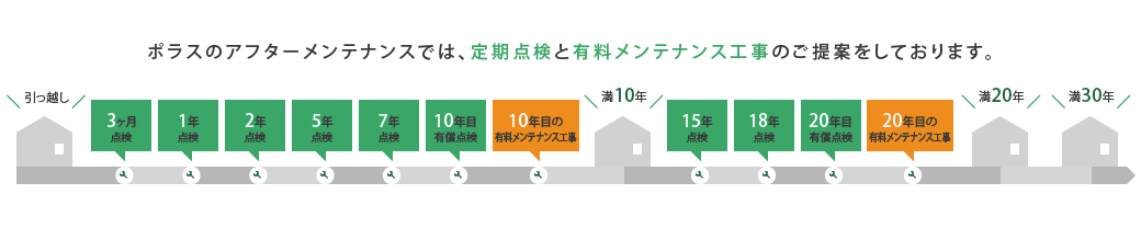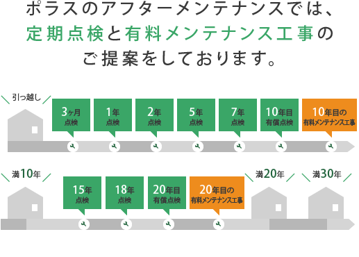 毎日生活するお住まいだからこそ、プ口の目で、定期的に状態をチェックし、本来の性能を維持するための処置を早期に行うことが肝心です。自動車には「車検」という定期点検・整備があります。これは法律で定められているだけでなく、車の性能維持、故障箇所の早期発見には、欠かせないもの。同じように、家もきちんと定期的にメンテナンスしていくことが重要なのです。 ポラスでは、万が一売却することになってもメンテナンスの保証制度は引き継がれます。更に建築及び維持保全に関する住宅履歴情報を管理し、資産価値を維持する取り組みをしています。