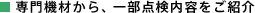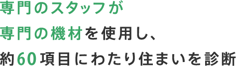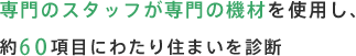 通常、目視となる屋根や床下など主要構造躯体に関連する部位に対して、専門機材を使用。更に約60項目にわたるチェックシートを用いて外部、内部、床下の状態を診断いたします。