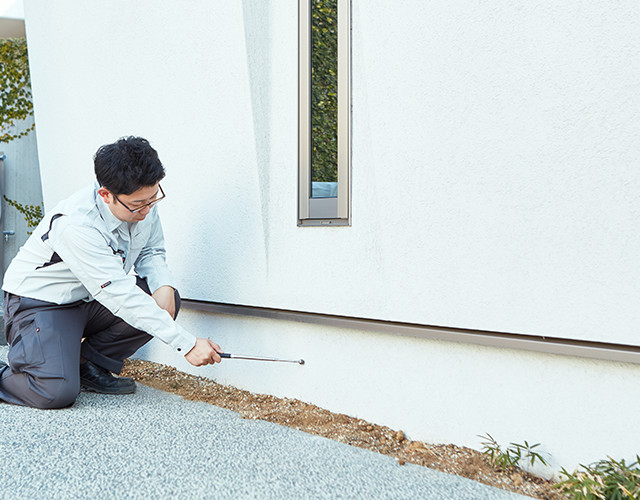 床下の白蟻消毒工事を行います。床下に消毒剤を散布し白蟻被害の発生を防ぎます。