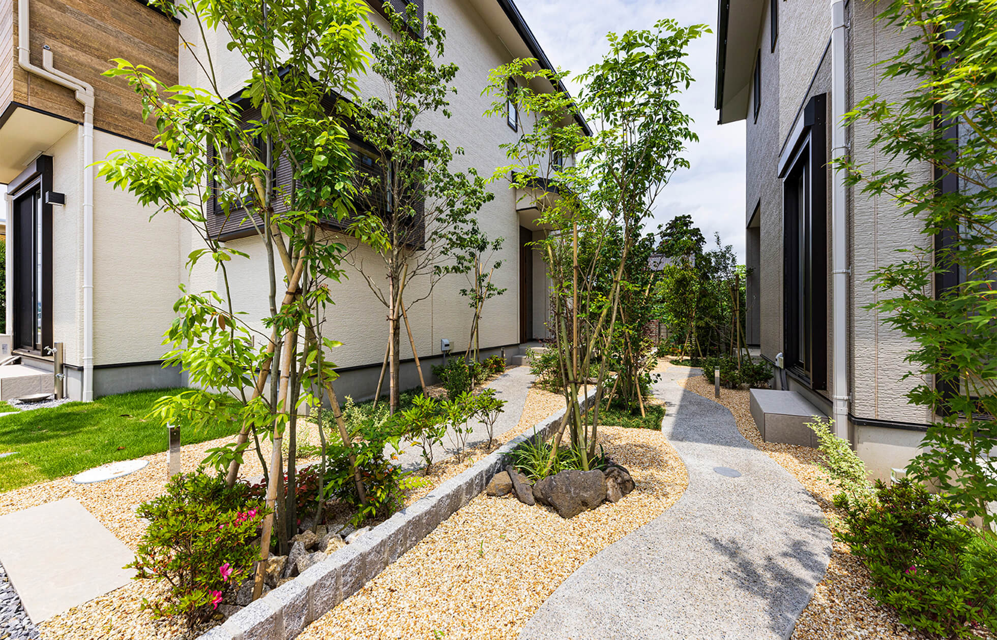 船橋市に計画する南側に道路が連続する全14邸の分譲住宅です。2棟で1つの単位として、互いに隣合うり敷地境界線側に通り庭を作ることで住宅の間にグリーンスポットを作り、建物のファサードが並ぶ単調な街並みからテーマ性を持たせた通り庭が間に覗く心地よい街並みを形成します。角地のような陽光の恩恵を受けることができ、自然を享受しながら住民同士のコミュニティを育む暮らし方を提案します。