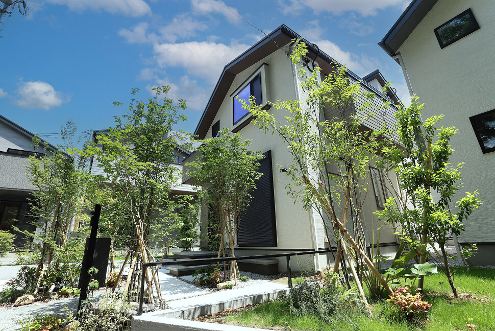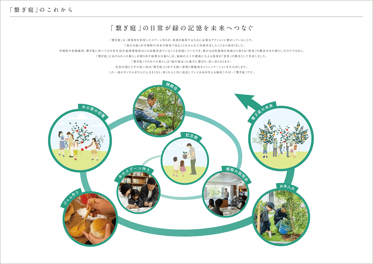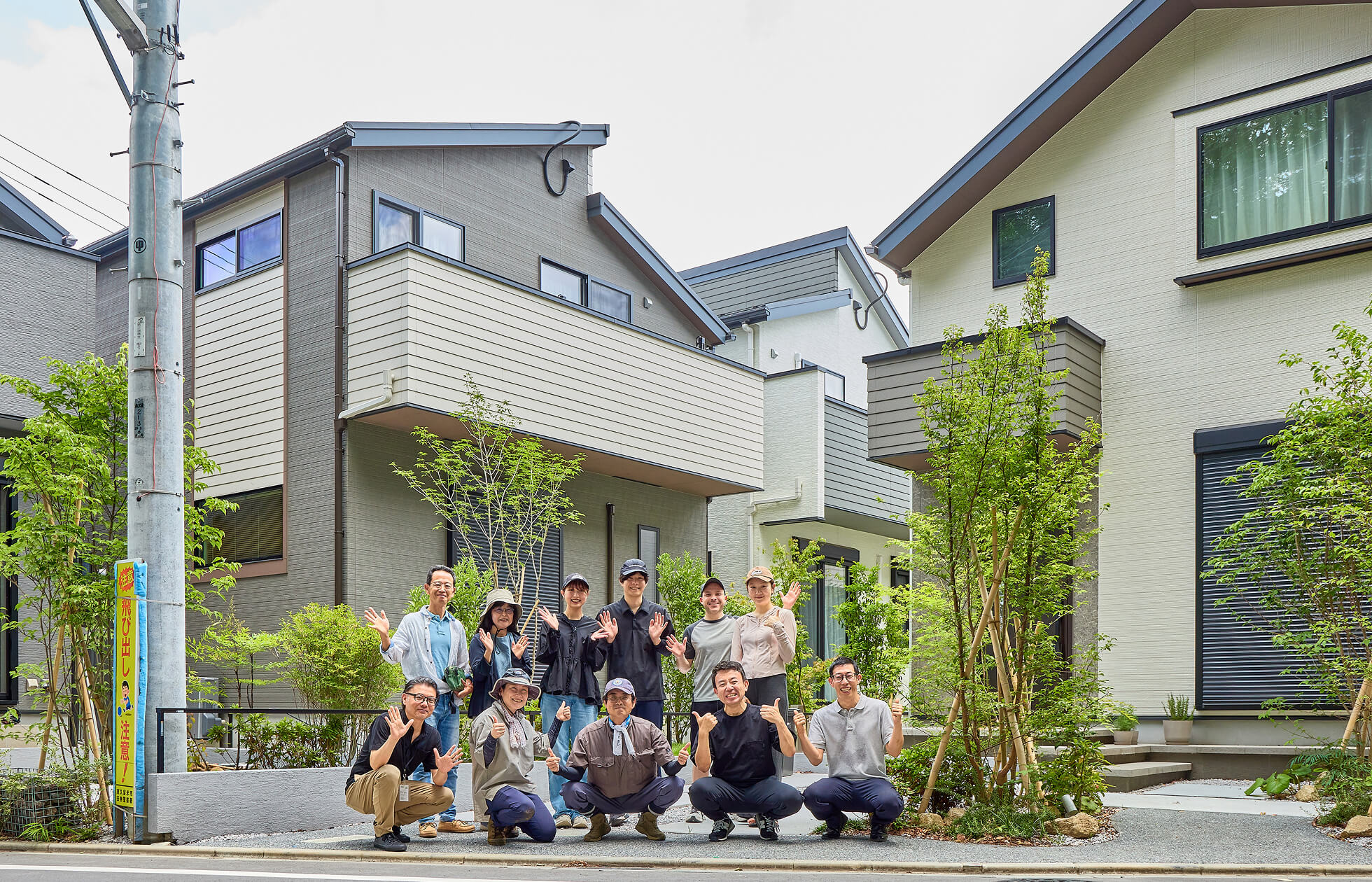 東久留米市学園町は、自由学園の移転を機に発展した緑豊かな学園住宅地で100年の歴史があります。美しい街並が残る一方で世代交代や加速する開発で緑豊かな街並とコミュニティが破壊されていくことを危惧し、何とか緑の環境を維持し、次の100年に向け、学園町らしさを継承していきたいという想いに共感しました。当分譲地では、住民が皆でつくる住環境としてわがまち意識を持ち、地域の緑の環境を育み、良好なコミュニティの醸成のため、分譲地独自の「緑の協定」を制定。周辺の景観を分譲地に引き込むため、地元造園学博士と在来種を中心に緑地率30%の植栽計画を実現。販売前からワークショップを開催し、学園町の「豊かな緑」がみんなの共有財産であるということに共感していただきました。「繋ぎ庭」における日々の緑豊かな暮らしが、強い愛情と積極的なコミュニケーションを生み出し、多くの人とつながる成長していく場所こそが「繋ぎ庭」です。