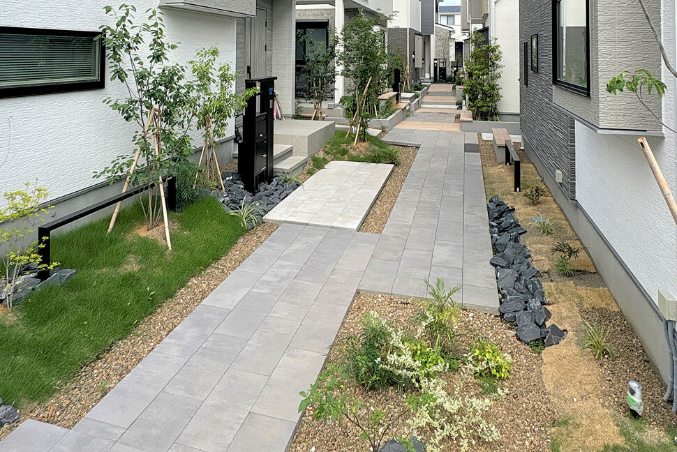 建物裏の隣棟間を広げ、緑地と風通し、人の往来を目的とした遊歩道