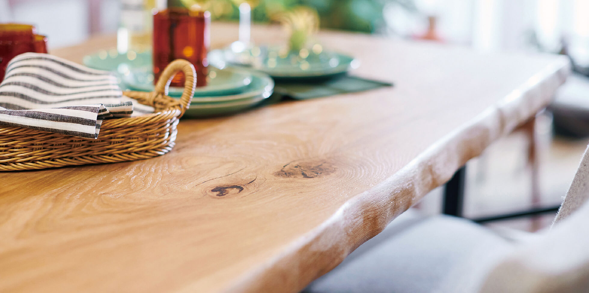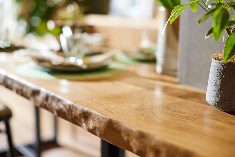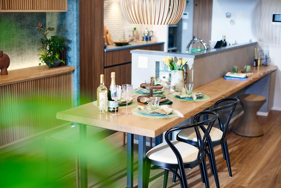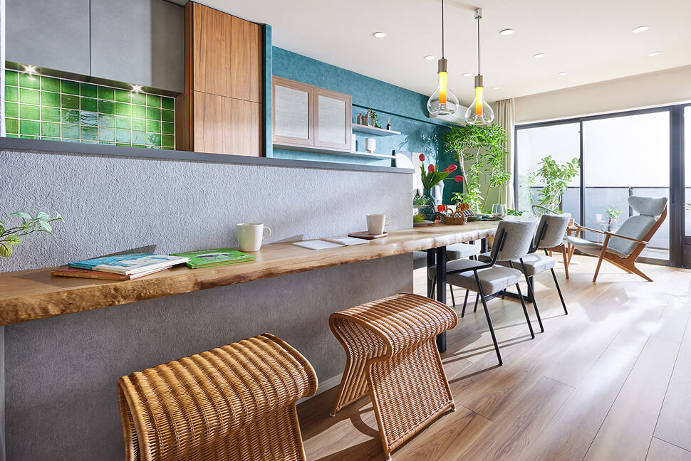 家族が多くの時間をともに過ごすリビングダイニングに、家族で囲める無垢材のカウンターテーブルをご提案します。