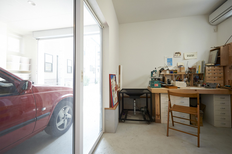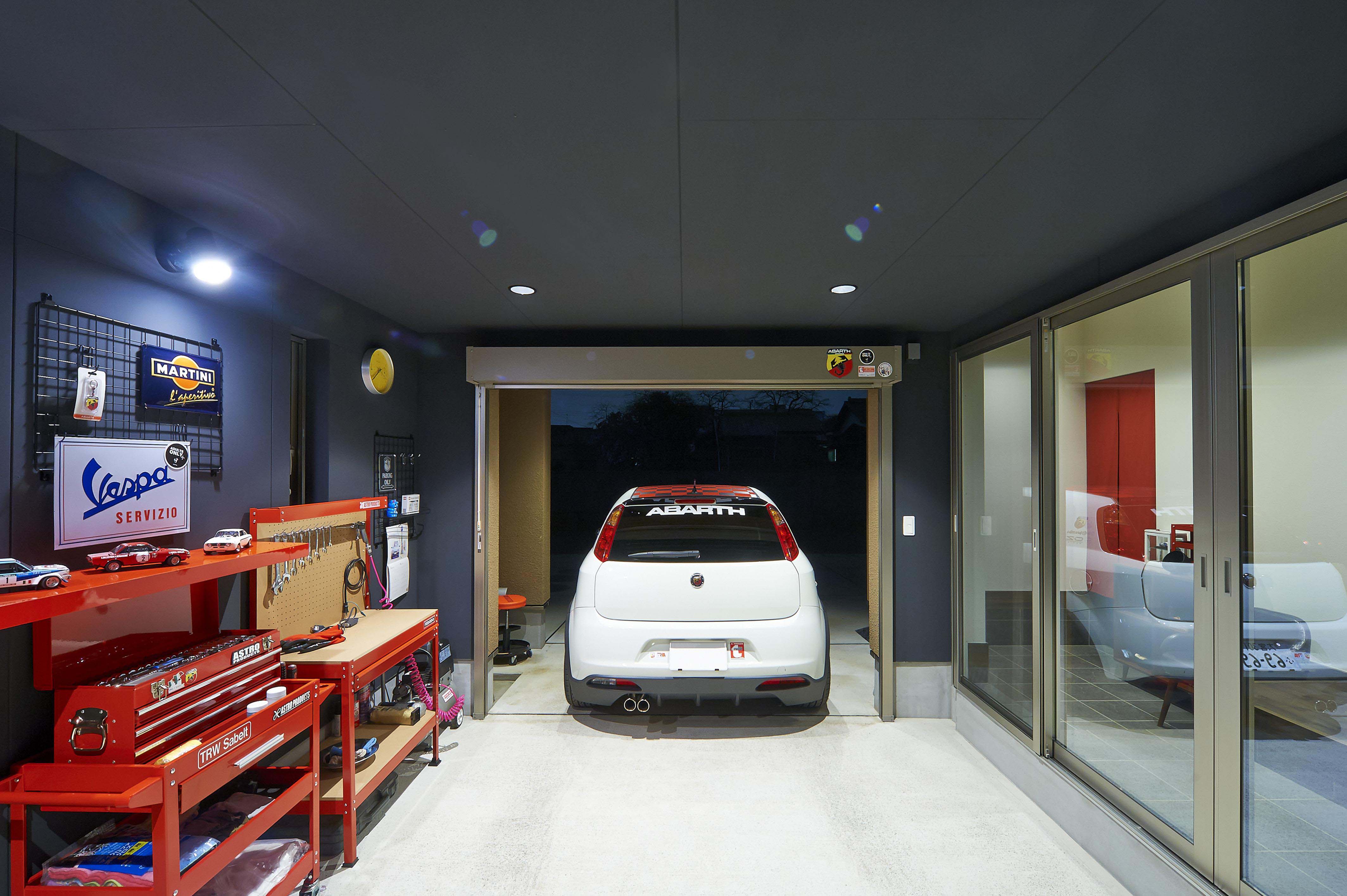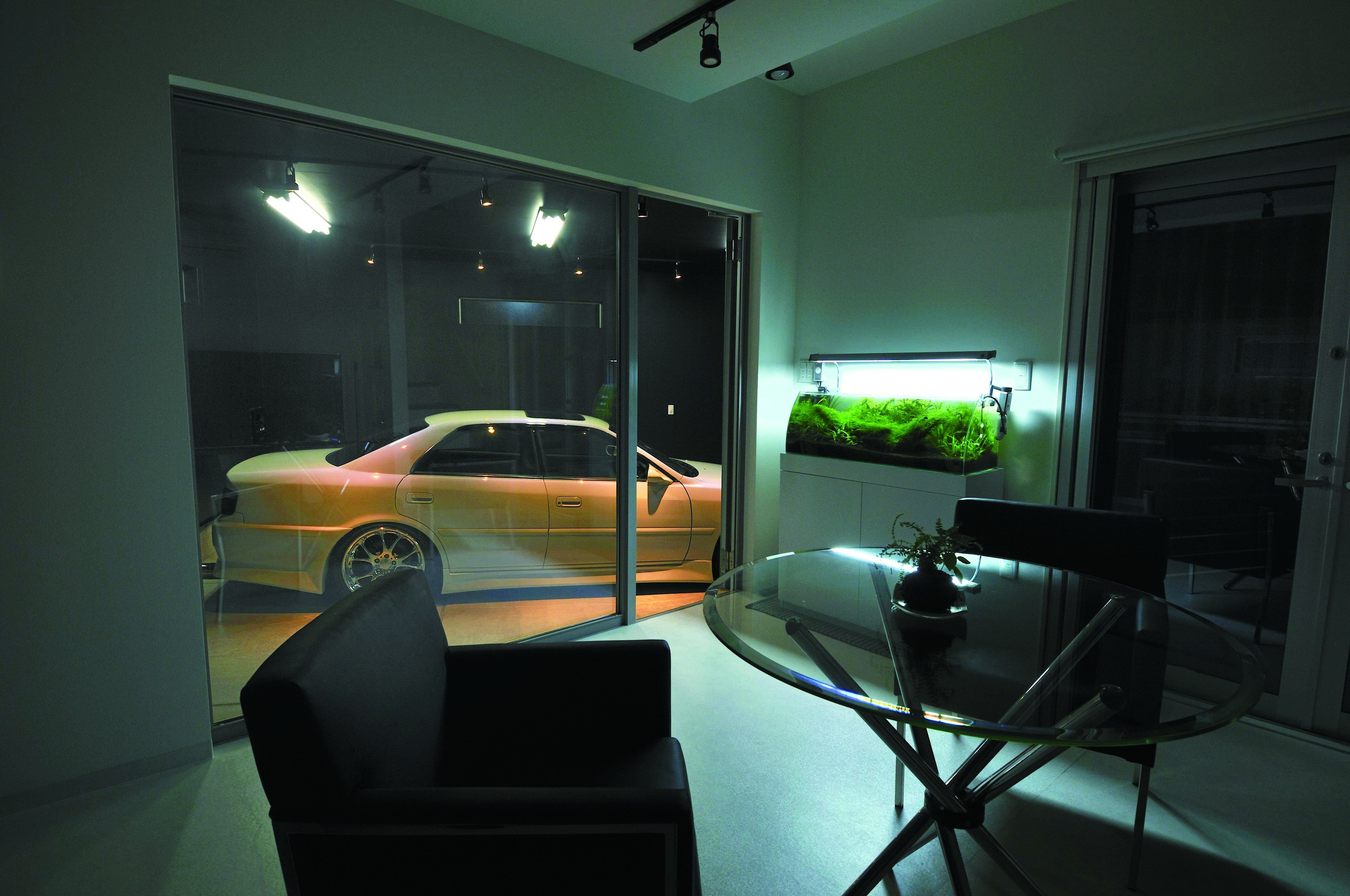 「愛車を近くに感じたい!」という要望に仕事部屋や書斎・ラウンジを隣接したガレージ。