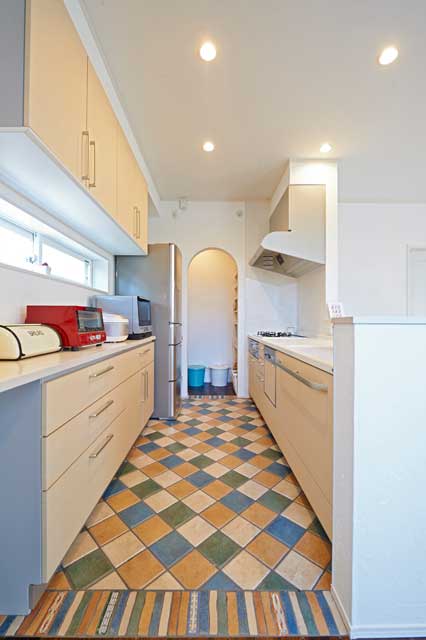 通常はクッションフロアという、柔らかい素材の床材をキッチンに敷く方が多いですが、カラフルなタイルを敷いてみたり、シンクの色をポップな色合いにしてあげるだけで、日々の料理も楽しくなるかもしれません。
