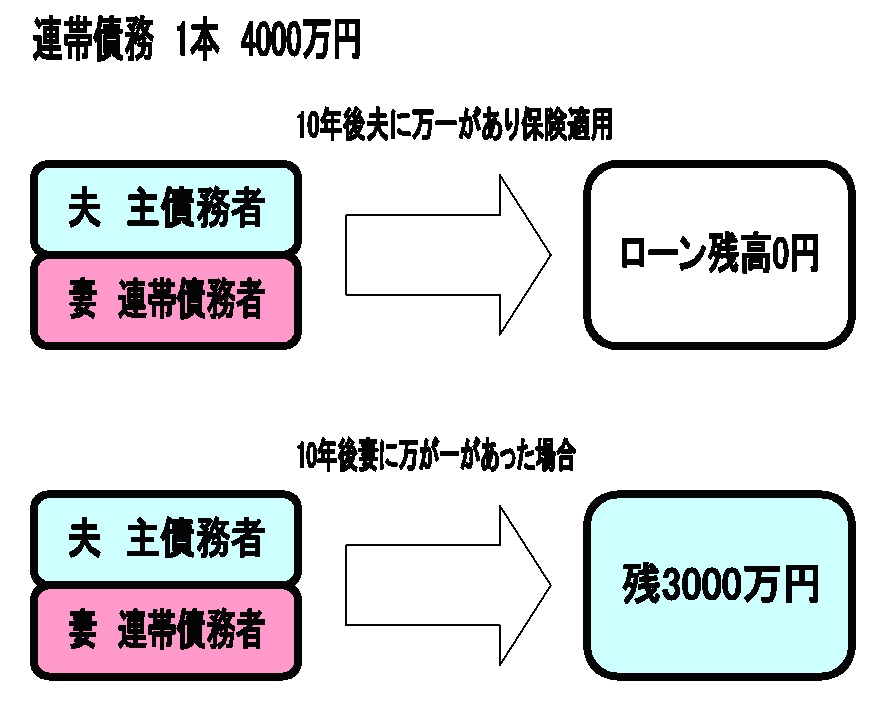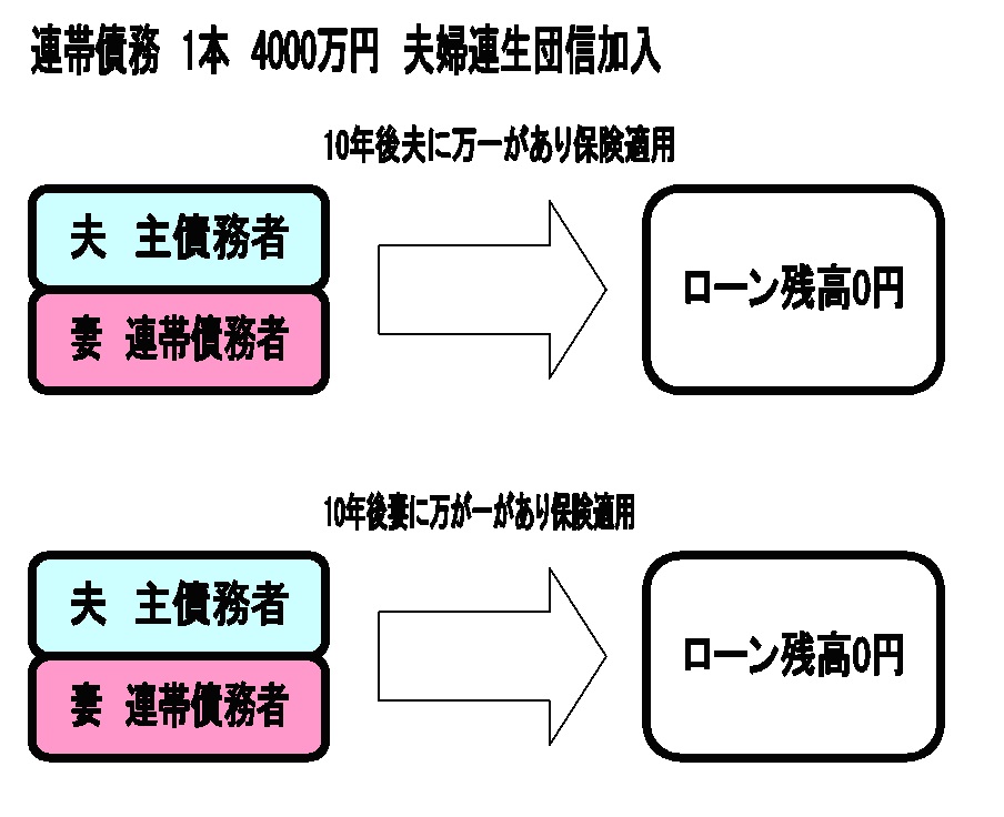 ご夫婦連帯債務の1本のローンを組み、夫婦連生団信に加入すると、ご夫婦のどちらかに万一の事があって保険適用となればローン残高が0円になります。