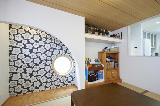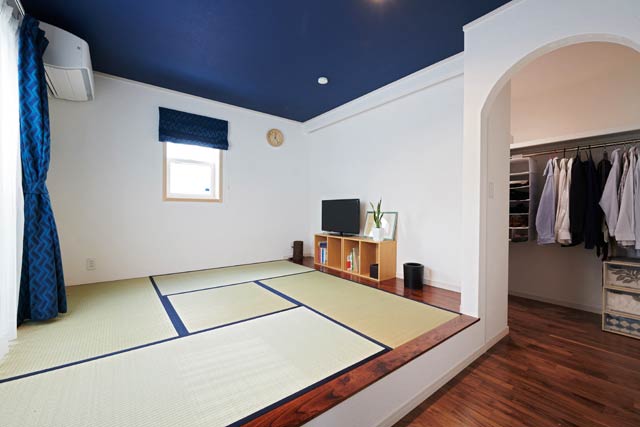 畳コーナーにネイビーのクロスで、和モダンな雰囲気になっています。