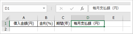 A1~D1セルに「借入金額(円)」「金利(%)」「期間(年)」「毎月支払額(円)」を入力します。