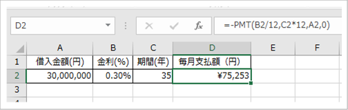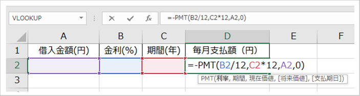 D2セルに「=-PMT(B2/12,C2*12,A2,0)」と入力します。(左の「」内の数式をコピペすればOKです。)※A2~C2セルに値がない場合、エラー表示(#NUM!)になります。