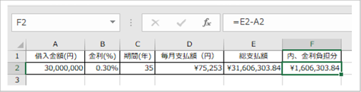 さらなる発展としてE1セルに「総支払額」、F1セルに「内、金利負担分」と入力し、E2セルに「=D2*C2*12」、F2セルに「=E2-A2」と数式を入れてみて下さい。