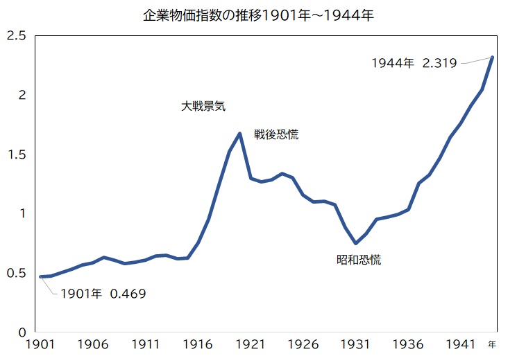この期間は地べたを這うようなグラフになっていますが、この期間も物価は上昇しており、1901年は0.469、1944年は2.319となっています。