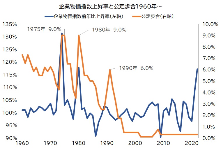 1990年代前半まで、日銀は民間金融機関に資金を貸し出す際の金利である公定歩合を主な政策金利としていました。今は呼称が「基準割引率および基準貸付利率」と変わり、直接的な政策金利としての役割も「無担保コールレート」(マイナス金利と言われるのはコレのこと)に譲りましたが、日銀の姿勢を表している金利であることには変わりがないので、1960年から2022年までのこの公定歩合(基準割引率および基準貸付利率)の推移と、企業物価指数の前年比上昇率の推移のグラフを重ね合わせてみます。