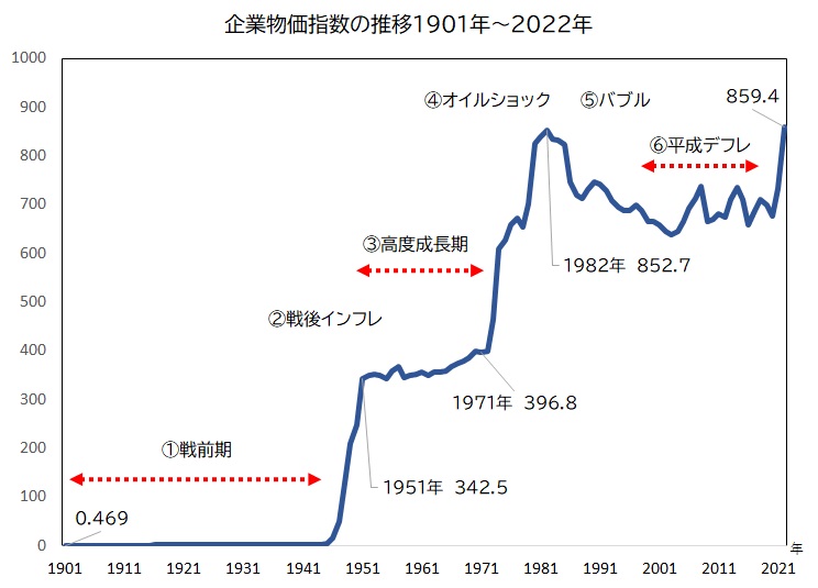 このグラフは1901年から2022年までの企業物価指数のグラフです。