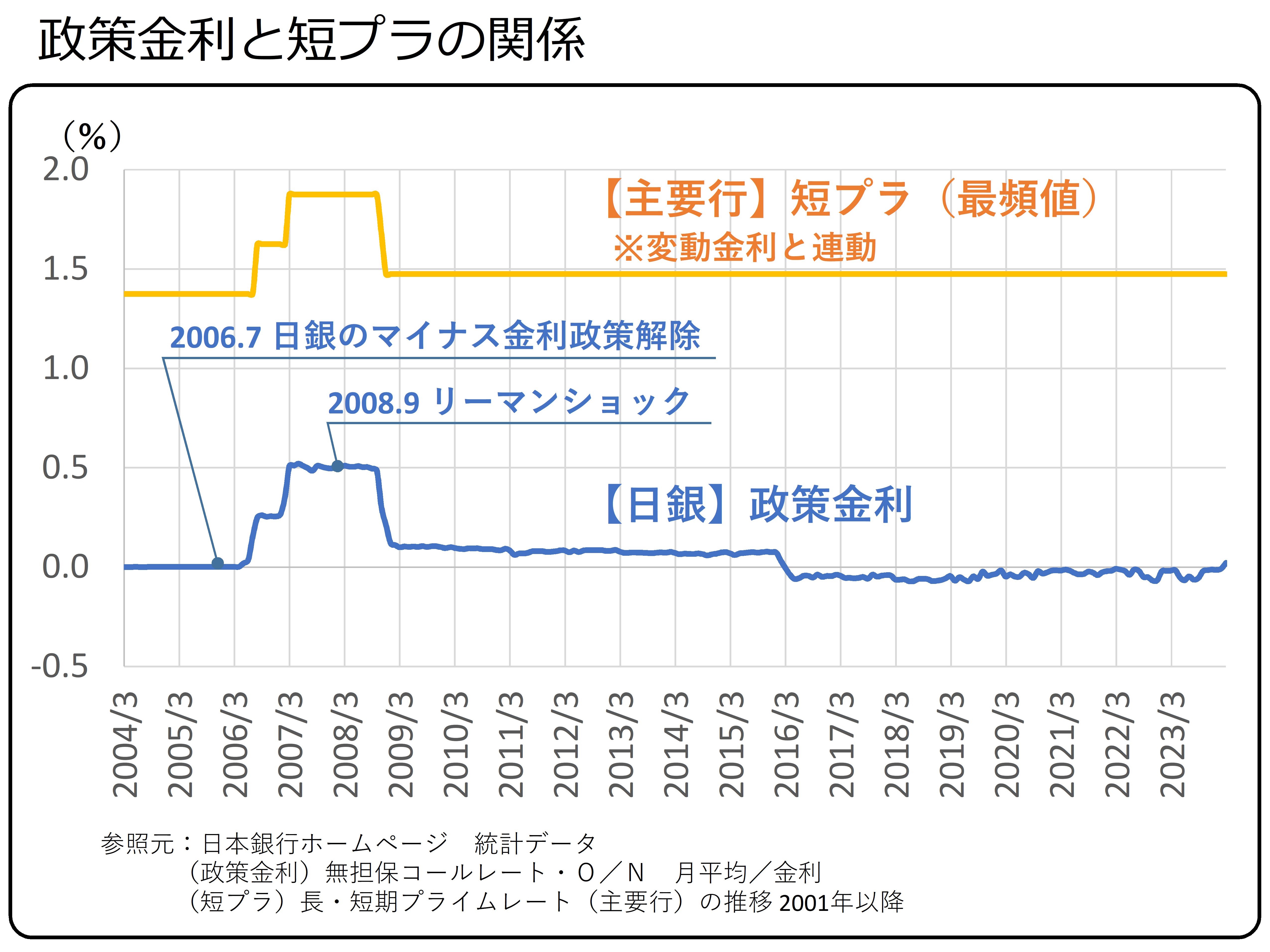 金利推移をみると、2006年7月から小幅な上昇はあったものの、2008年のリーマン・ショック後に再び政策金利、短プラともに解除前の水準に戻っています。