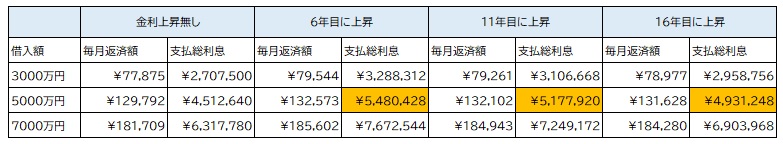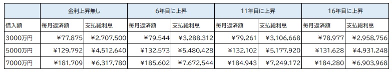 借入金額3000万円・5000万円・7000万円でそれぞれ6年目・11年目・16年目に当初の0.5%が0.65%に上昇したケースを考えてみましょう。借入年数は全て35年とし、35年間上昇が無かった場合が"金利上昇無し"になります。