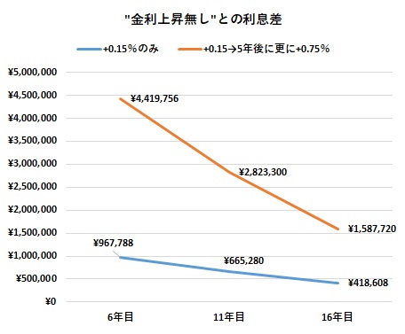 当初0.5%→6年目に+0.15%→その5年後に更に+0.75%というシナリオは、"金利上昇無し"よりも支払利息が4,419,756円も増えるという計算ですから、追加で+0.75%は+0.15%のみに比べて相当に影響が大きいです。