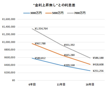 ずっと0.5%を想定する"金利上昇無し"との利息差は、早い年数で金利が上がったほど顕著に大きくなることがわかります。