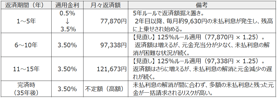6年目以降: 返済額は125%ずつ増えますが、繰り延べられた未払利息を抱えているため、元金の減り方が遅れ、最終的にローン期間内で完済できなくなる可能性が高くなります。
