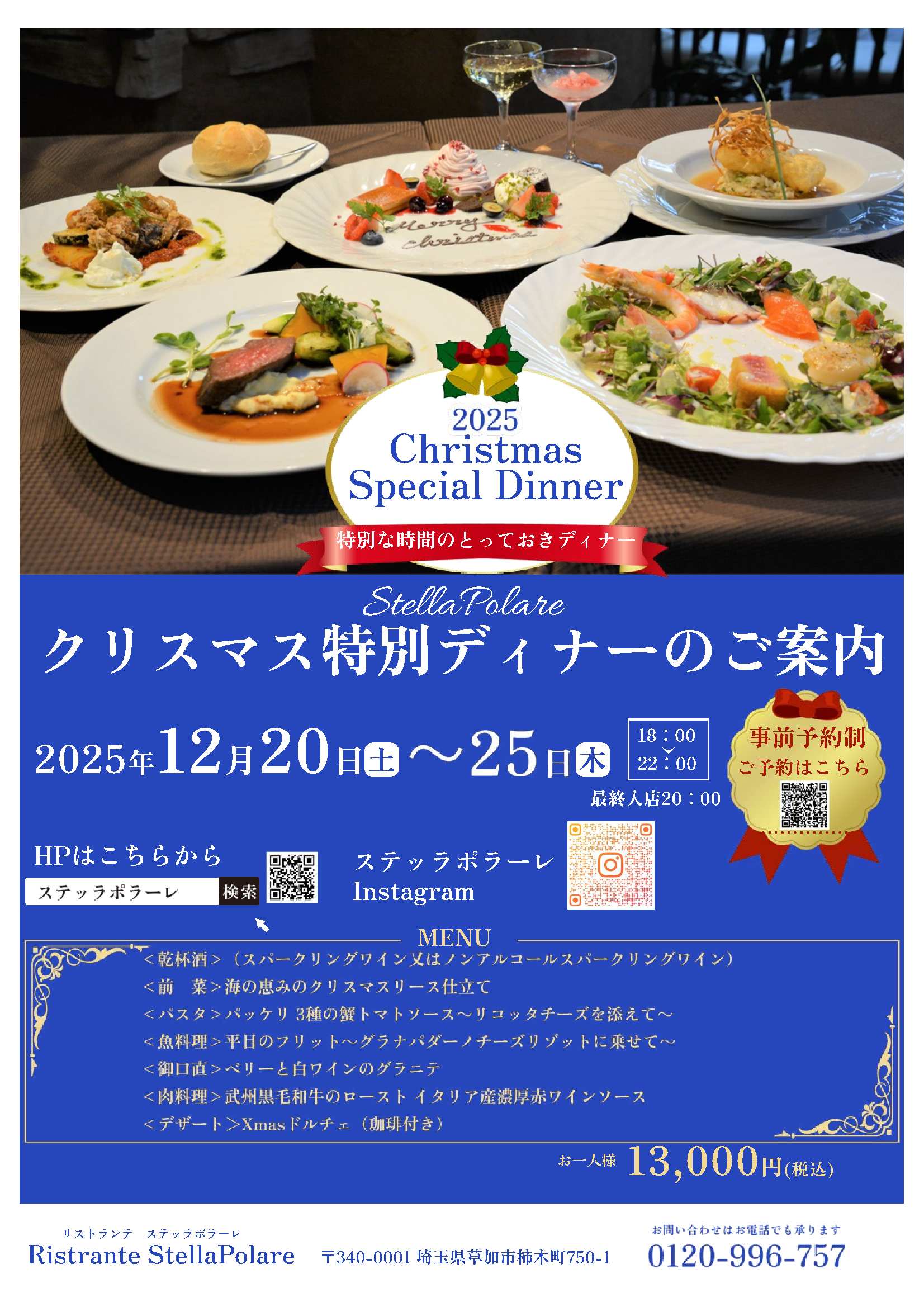 大切な方とクリスマスディナーを是非ステッラポラーレでお過ごしください。