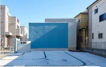 前面道路から見たときに「本当に家?」と思わず言いたくなる、シンプルでスタイリッシュな外観の平屋です。外観のコンセプトは美術館で、ブルーの壁に映る、時間ごとに角度を変える影まで、デザインの一部に取り込んでいます。