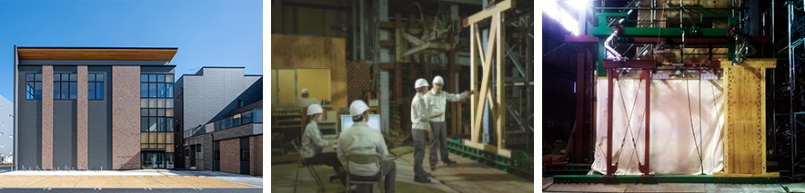 研究所にある実験棟では、様々なアイデアを数多くの実験により検証し、より良い住空間の提案ができる耐力壁を開発。